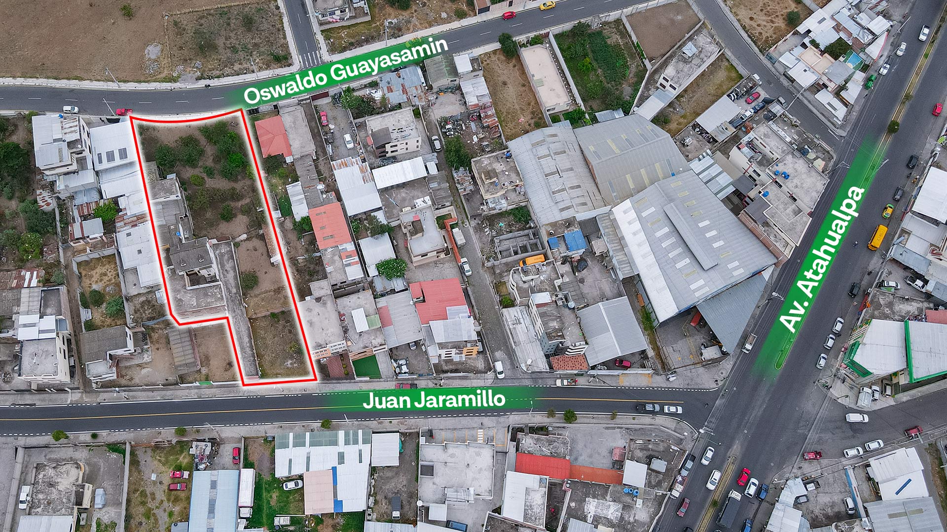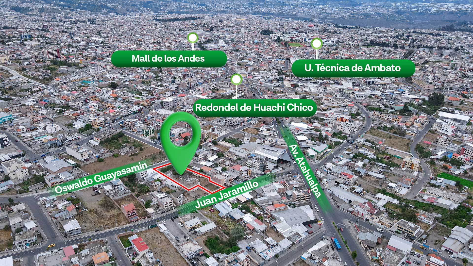 Sector Huachi Chico, sobre las calles Oswaldo Guayasamín y Juan Jaramillo, a pocos metros de la gasolinera de Huachi Chico, salida directa hacia Riobamba. Zona urbana consolidada, con alto flujo vehicular y fácil acceso a transporte público.